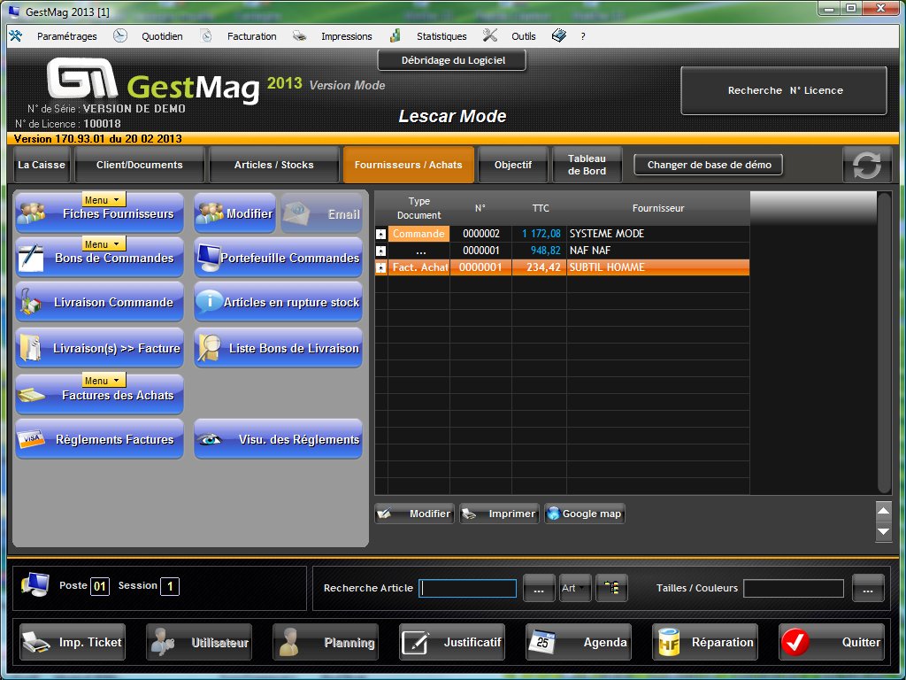 Onglet de la ligne des achats avec : fiche fournisseur, bon de commande, bon de livraison, facture achat, règlements des factures d'achats ...etc